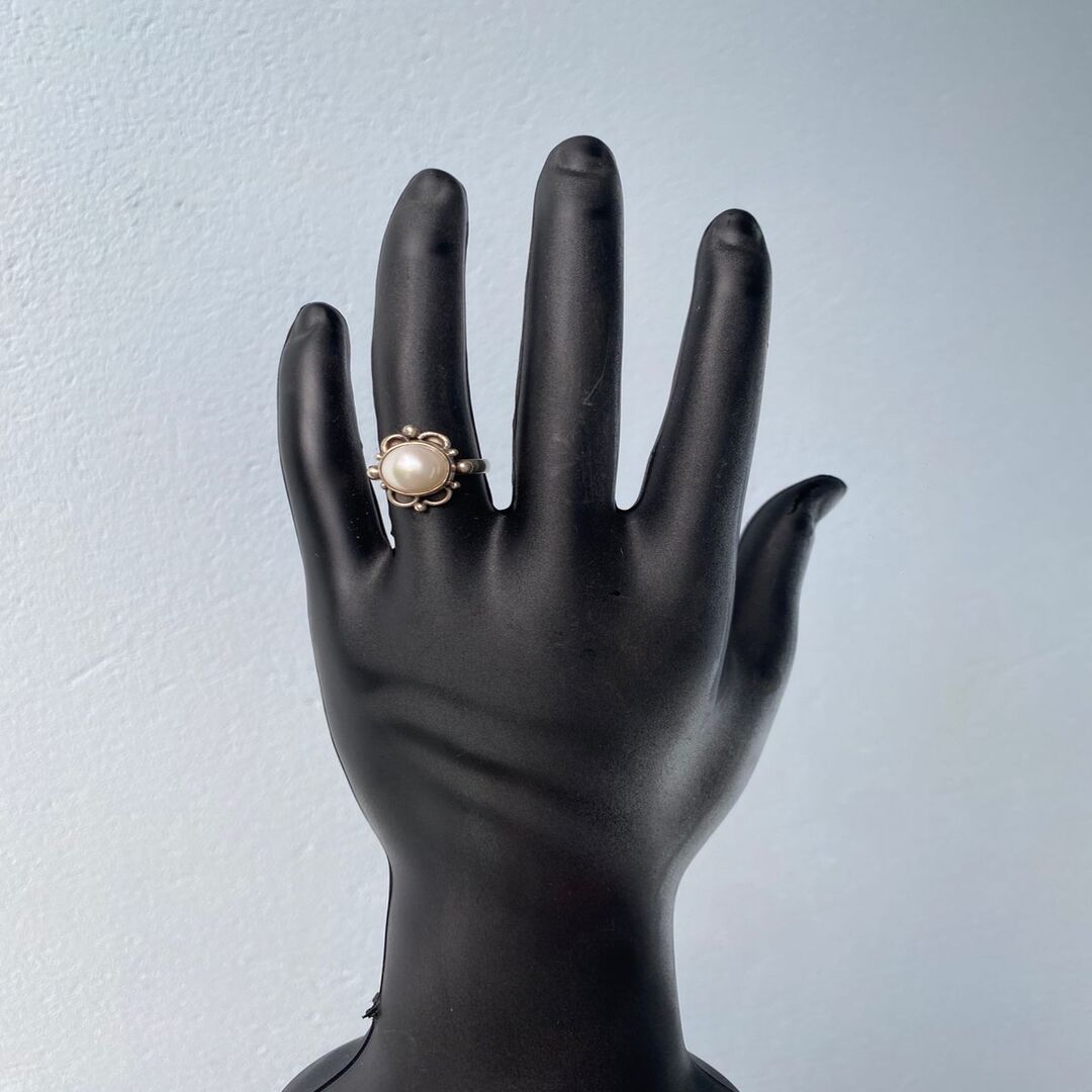 Anel artesanal arredondado com centro em pérola.