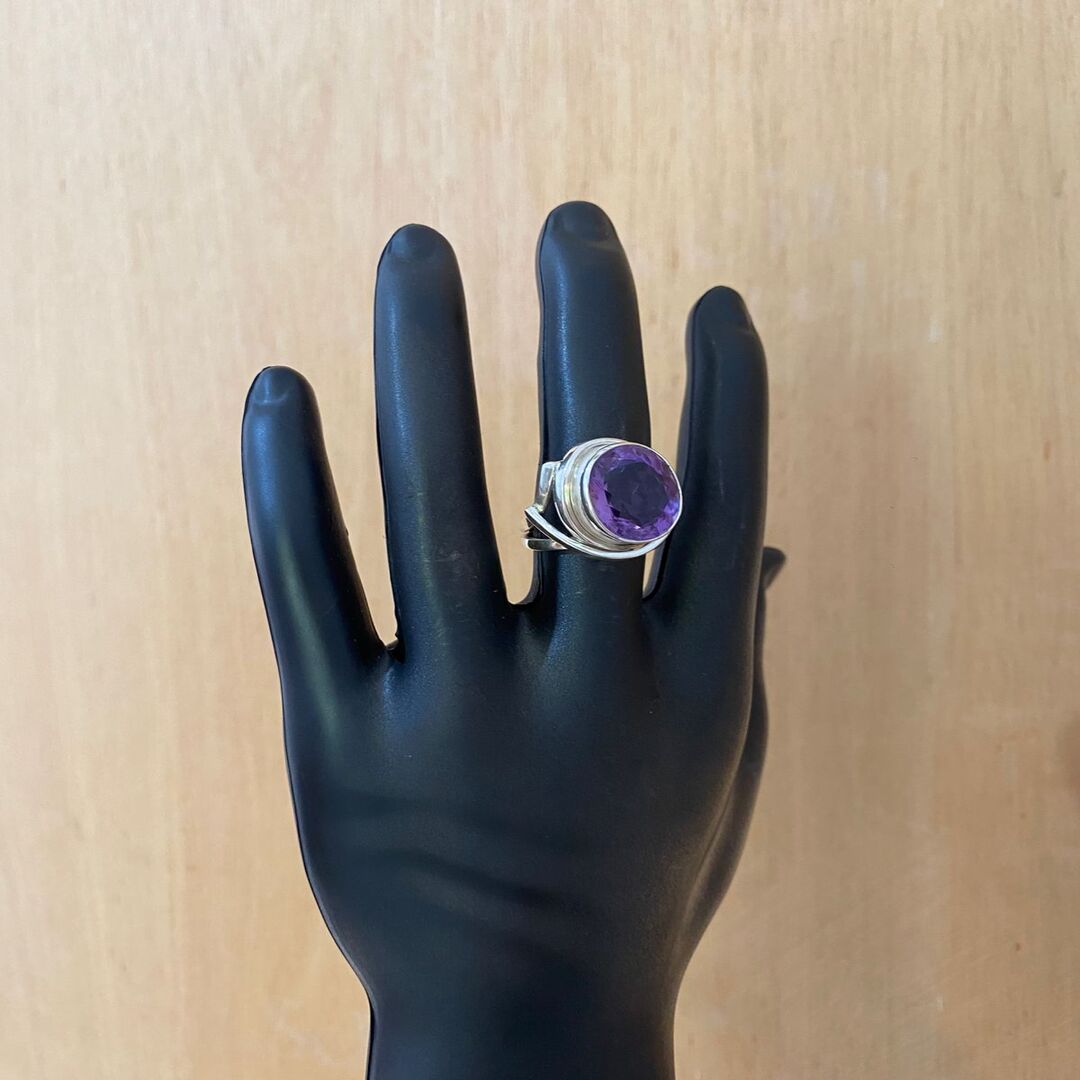 Imponente e cheio de personalidade, este anel robusto em prata valoriza a presença marcante da ametista, com seu tom violeta intenso e sofisticado. O aro mais largo e encorpado reforça o caráter forte da peça, criando um contraste elegante com a transparência e o brilho natural da pedra.