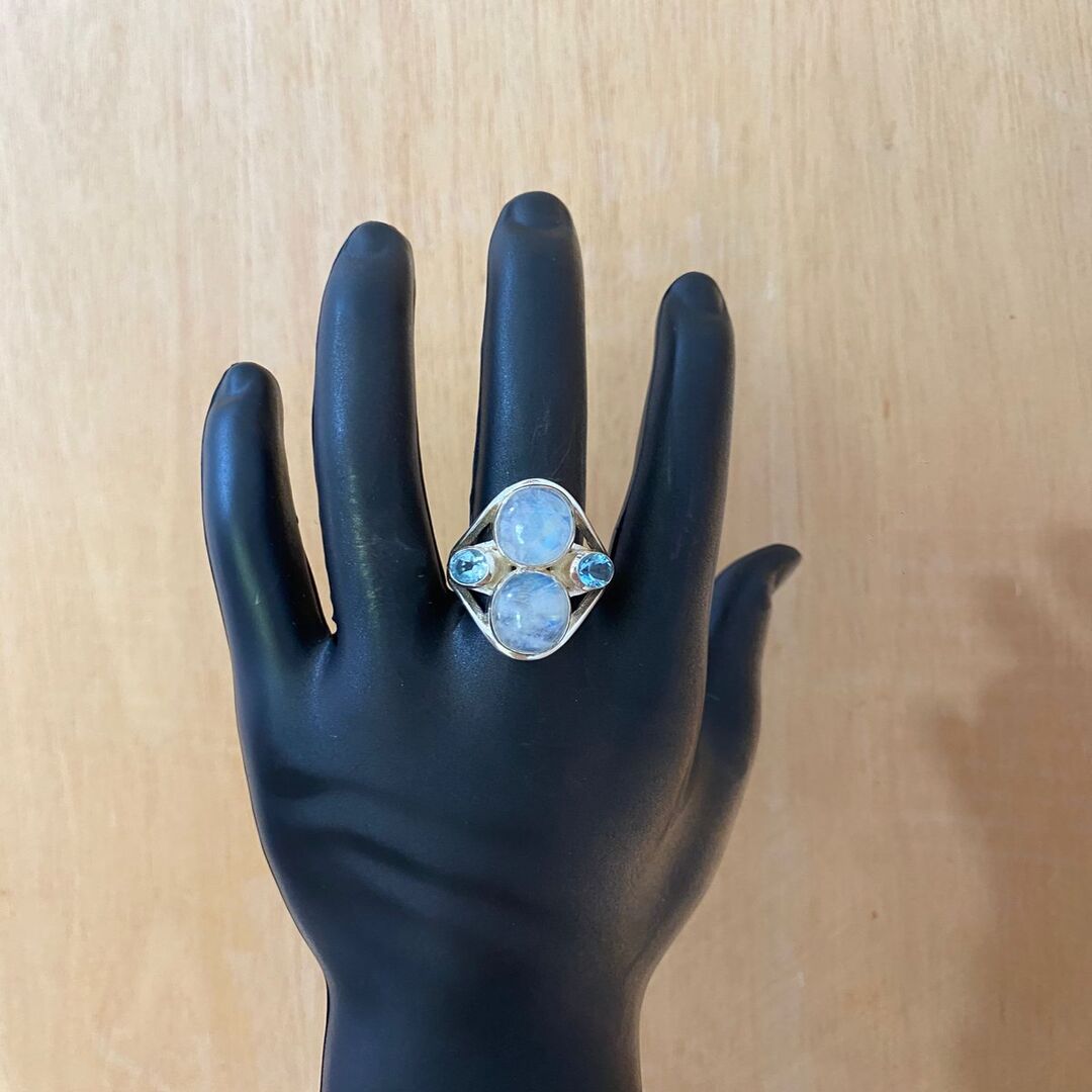 Anel artesanal em prata com Pedra da lua e Topázio azul.