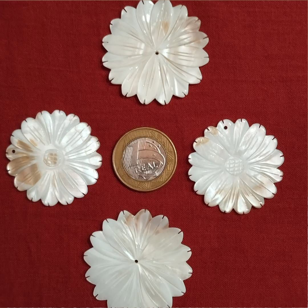 Essas flores esculpidas em madre-pérola destacam-se pelo brilho suave e pela delicadeza dos detalhes. Cada pétala foi cuidadosamente trabalhada, criando um efeito luminoso e elegante que valoriza a beleza natural do material. As variações sutis de tom e o acabamento polido tornam cada peça única, perfeita para aplicação em joias, bordados ou acessórios sofisticados, trazendo leveza, requinte e um toque orgânico inspirado no mar.